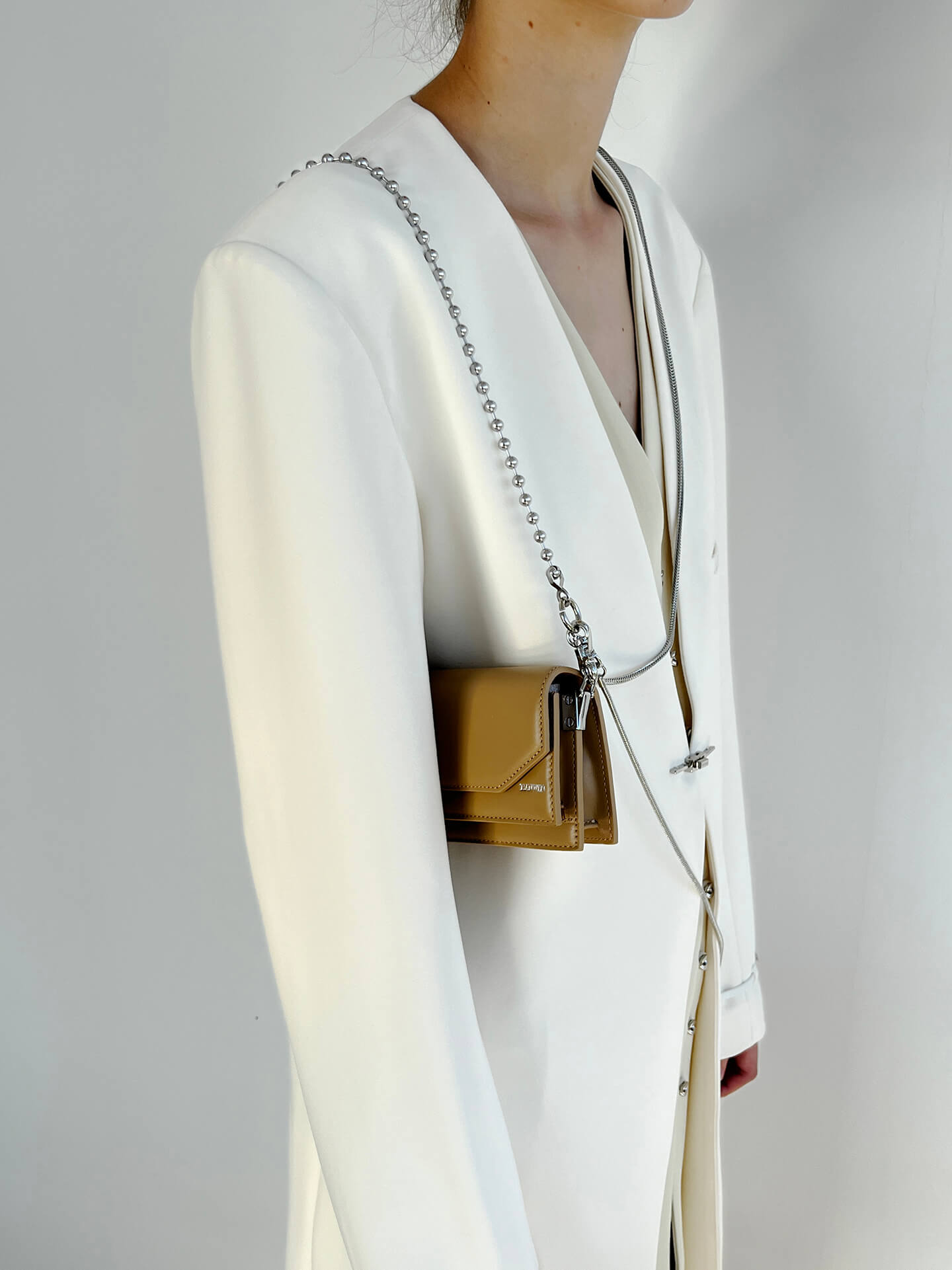 • One detachable silver-tone ball chain for shoulder carry